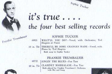 Some advertisements duplicated are those featuring the Dorsey Brothers and Their Orchestra (August 1929), Miff Mole (Okeh 41273--"Birmingham Bertha"), Emmett Miller, Frankie Trumbauer (Okeh 40979--"Mississippi Mud"), Bix Beiderbecke and His Gang (Okeh 41001--"Sorry" is listed among 5 other new Okeh discs in a full-page ad in the April 1928 issue of TMW), Seger Ellis, Joe Venuti, Ted Lewis (when he had a HOT band!), Charles W. Hamp ("The California Blue Boy"), Rudy Vallee, Two Black Crows, etc. etc. We see rare images of Bing Crosby, Boswell Sisters, Billy Jones, etc. Virtually no 78 rpm collectors have actually SEEN copies of Talking Machine World, the super-rare phonograph trade journal.